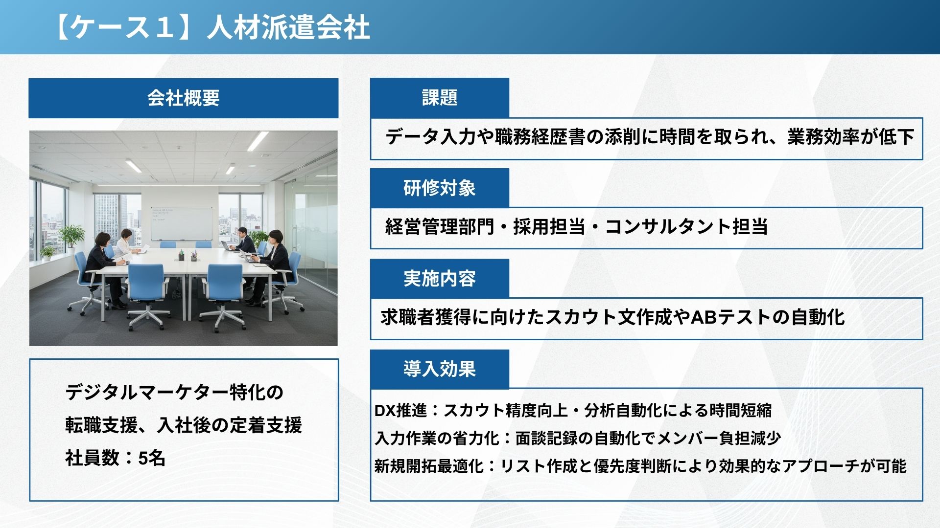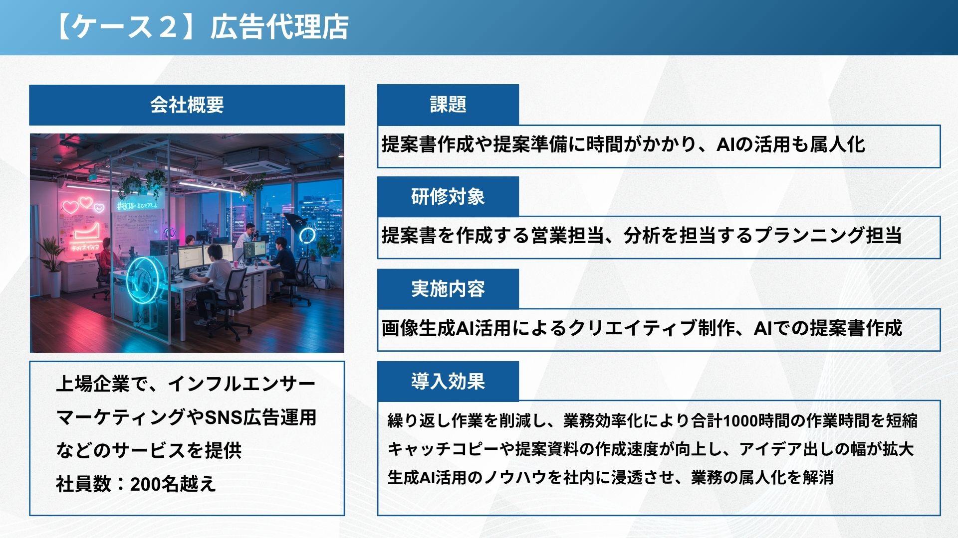 企業がAIを導入しても、 現場の業務が変わらなければ意味がありません。 私たちのAI研修は、 「最先端を学ぶ場所」ではなく、「業務を変え、利益に直結させるための研修」です。